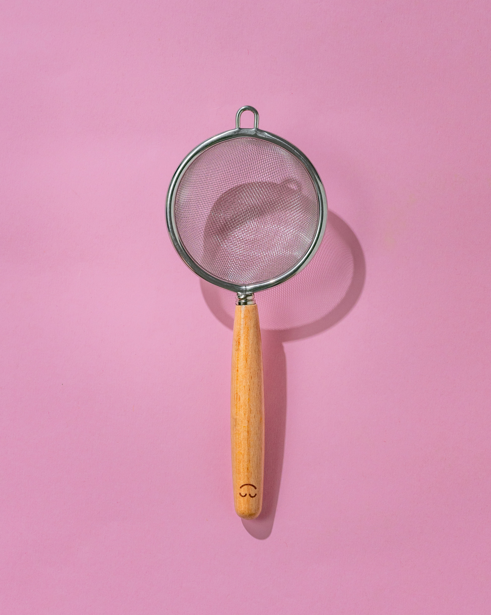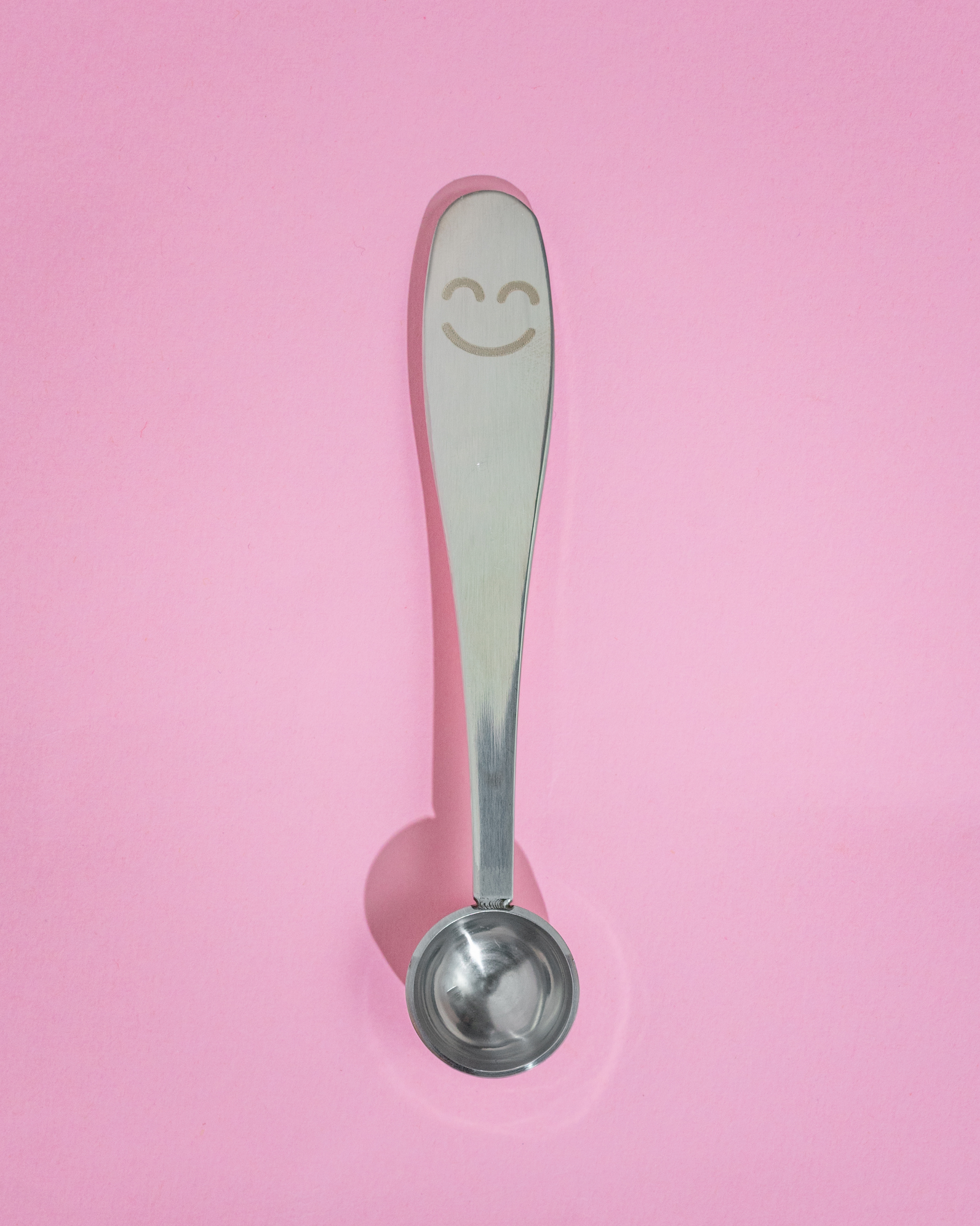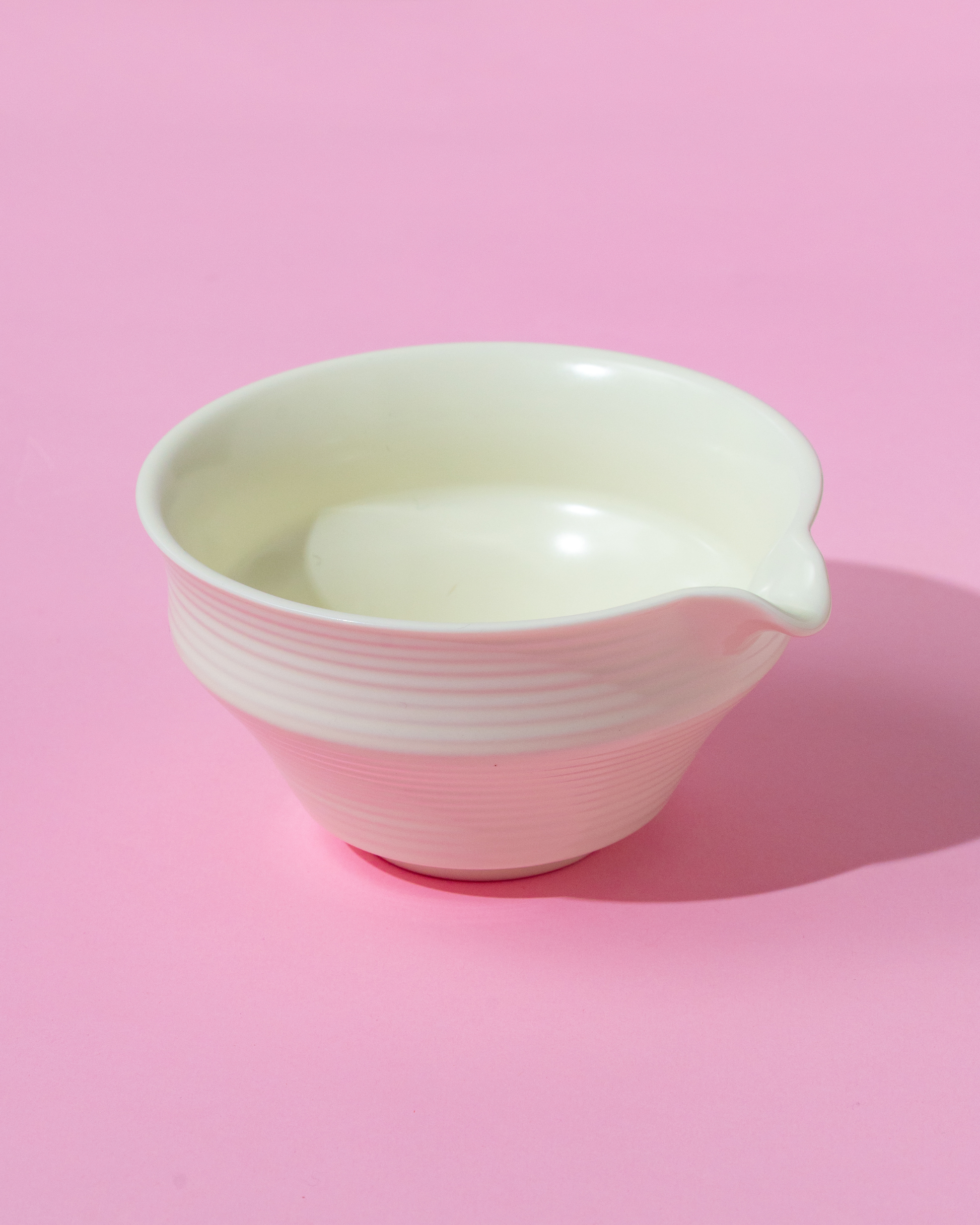 - Off-white ceramic bowl — with a soft pour lip and embossed smile detail