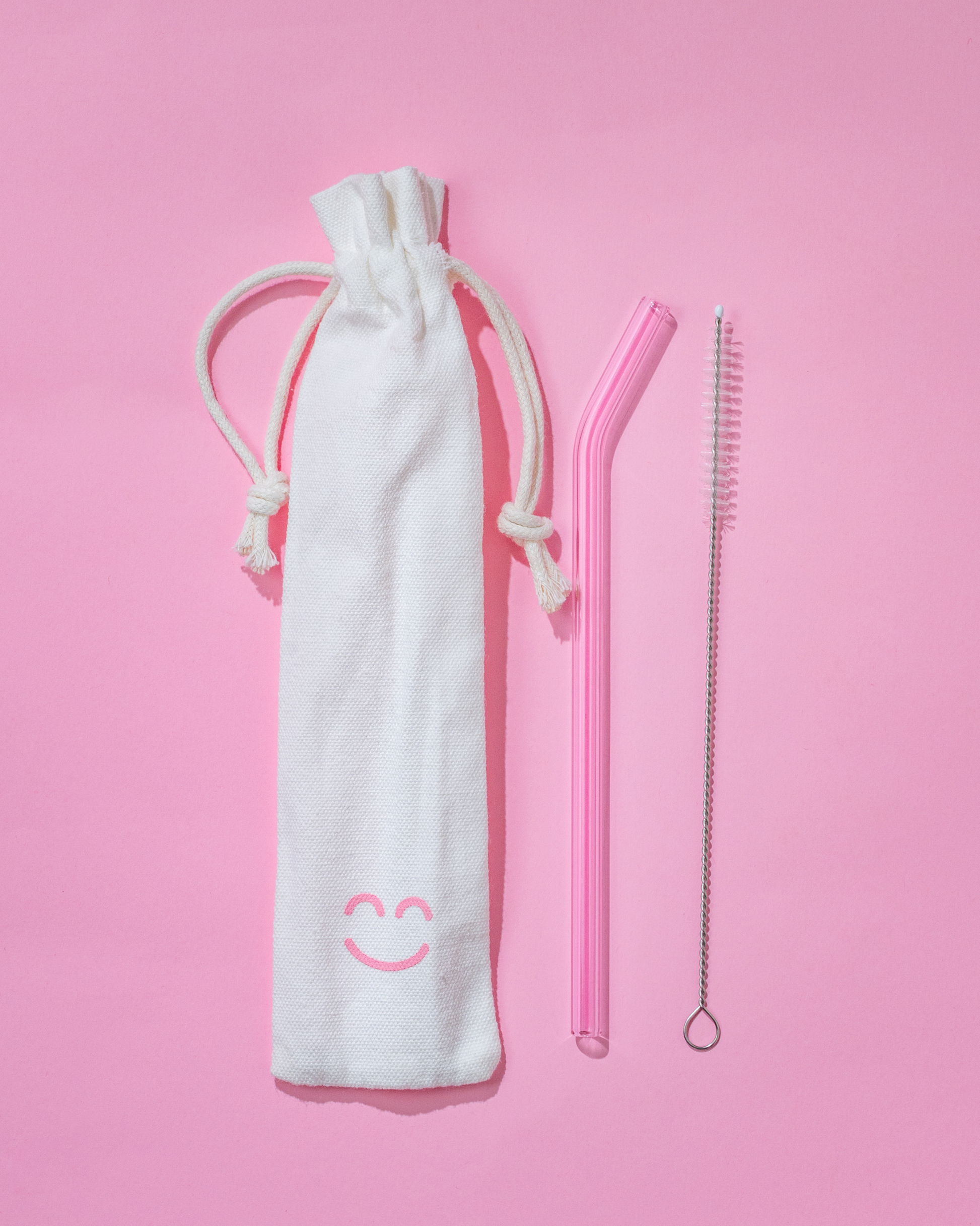 - Pink glass straw with cleaning brush and cotton carry pouch